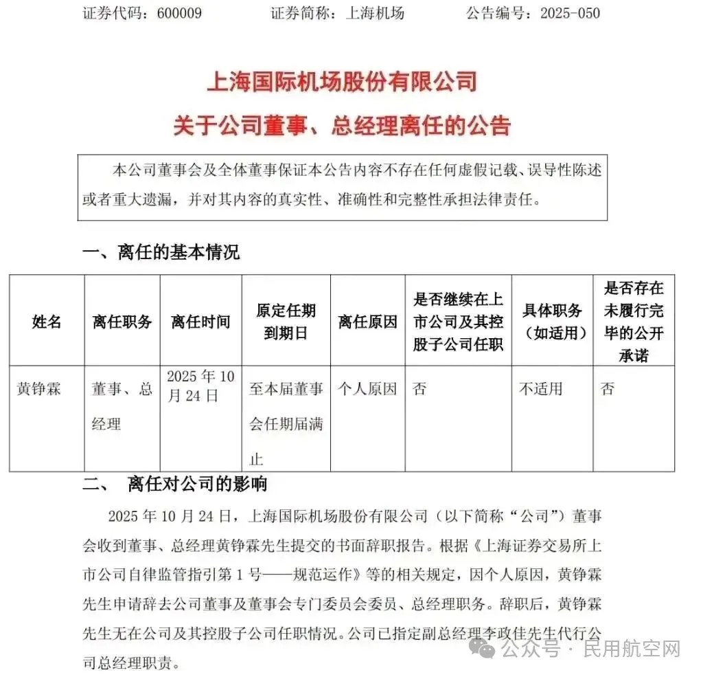 任职9个月,上海机场总经理黄铮霖因个人原因离任
